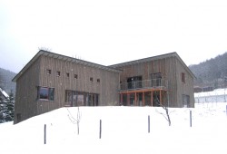 Auf einem 2000 m2 in traumhafter Höhenlage wünschten die Bauherren ein ökologisch orientiertes Haus in Holzbauweise, das ein Wohnhaus für eine fünfköpfige Familie und eine Landarztpraxis beherbergt.