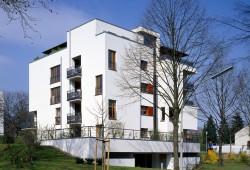 Die Bauaufgabe war ein Mehrfamilienhaus mit Tiefgaragenstellplätzen auf einem zentralen Grundstück einer Genossenschaftssiedlung in Köln-Porz.