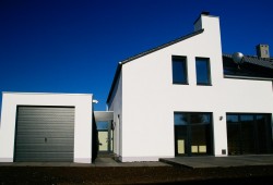 Das Wohngebäude für zwei Familien in Bornheim sollte sich an ein bestehendes Mehrfamilienhaus mit einer lang gestreckten Lagerhalle anfügen.
