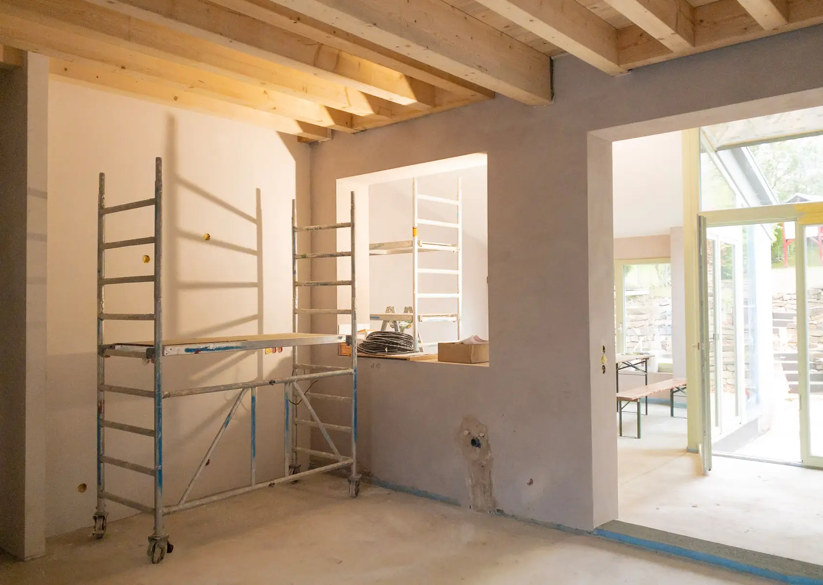 Entstanden ist ein lichtdurchfluteter zentraler Wohnbereich mit Öffnung zum Garten, ein Kinderbereich im Zwischenbau mit eigener Aussentreppe und ein Bereich mit Büroateliers im vollkommen nun offenen und in Stand gesetzten Fachwerkhaus.