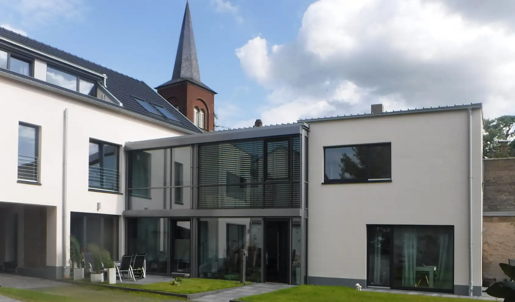 Alle zusätzlichen Hofgebäude wie Garagen und Wellkunststoffüberdachungen wurden entfernt und die große Hoffläche begrünt und als Garten- und Terrassenflächen den Wohnungen zugeordnet.