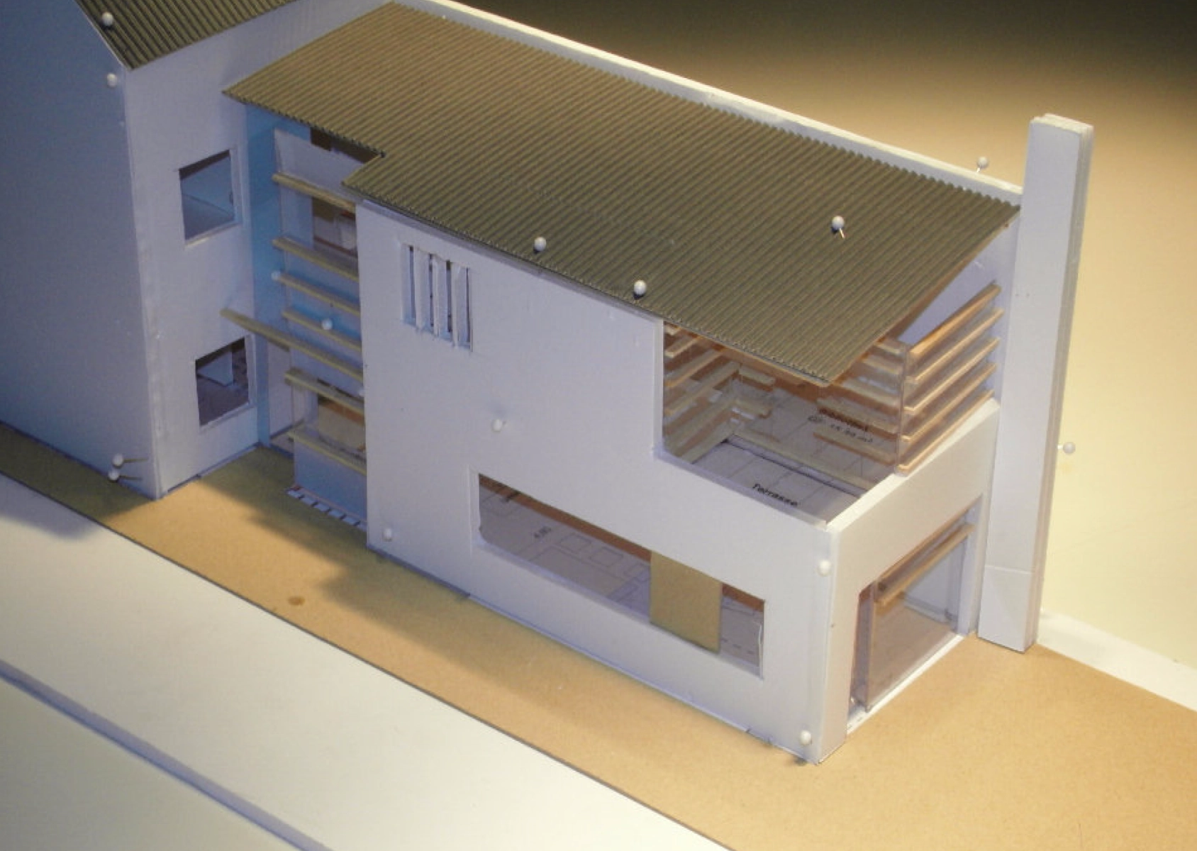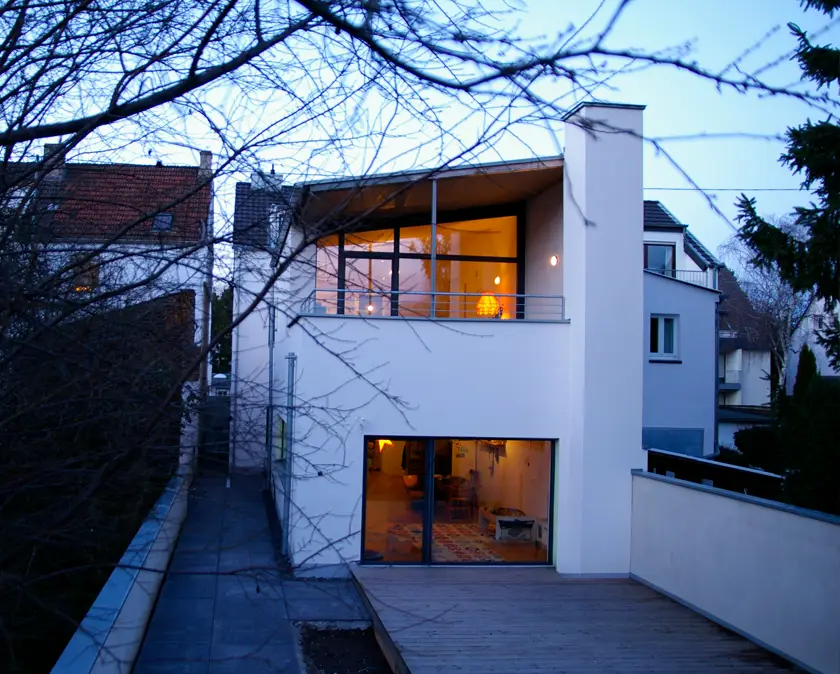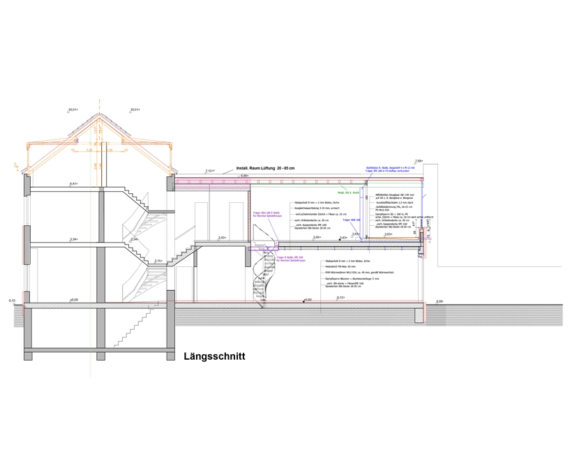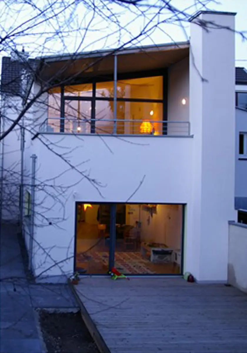 Die neuen Eigentümer wollten neben der Wohnnutzung im Erdgeschoss Flächen für eine Tageskindergruppe schaffen. Mit einem Arbeitsmodell, einer baurechtlichen baurechtlichen Abklärung und vielen 3D-Studien begann die Planungsphase im Frühjahr 2011. Dabei galt es,  die Baukosten auf 270.000 € zu begrenzen. Trotzdem  sollte auf ein offenes Wohnen, große Fensterflächen,  Brennwertheizung und kontrollierte Lüftung mit Wärmerückgewinnung nicht verzichtet werden. Seit März 2012 ist das Haus von der Familie bewohnt und wird parallel als Tageskindereinrichtung genutzt.